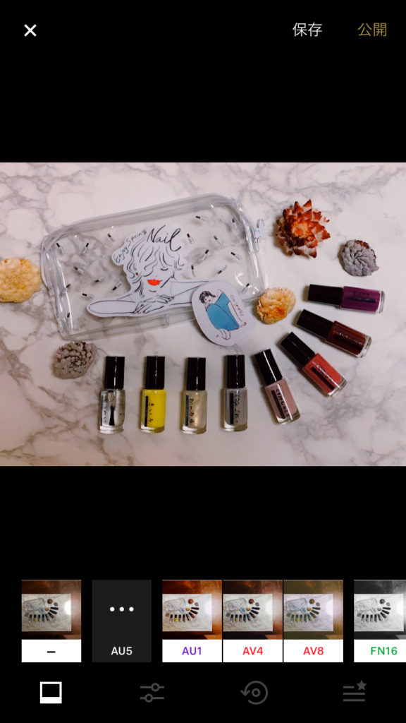 トリミングして加工した完成写真です。マニキュアがくっついてるものがあるし、マニキュアの名前が上を向いてないものもあるし、それになんとなく寂しいですね…