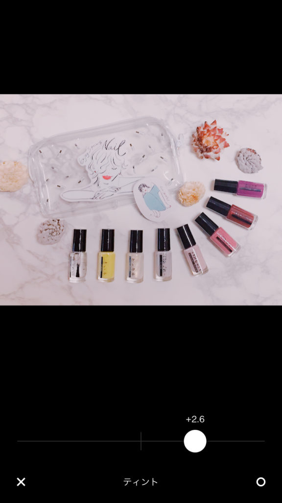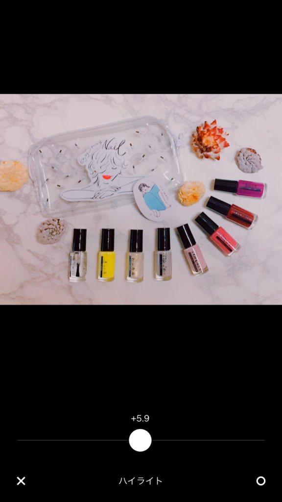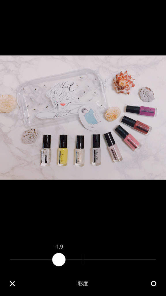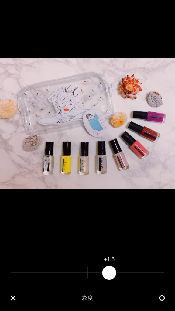 次に彩度の設定ですが、今風のおしゃれ写真は彩度を下げた写真が多いのに、なんと彩度を上げるという暴挙に出てしまいました。理由は「マニキュアの色味をハッキリ出したーい!」というグラフィックデザイナーという職業故からでした。商品は綺麗に見せたいですものね!